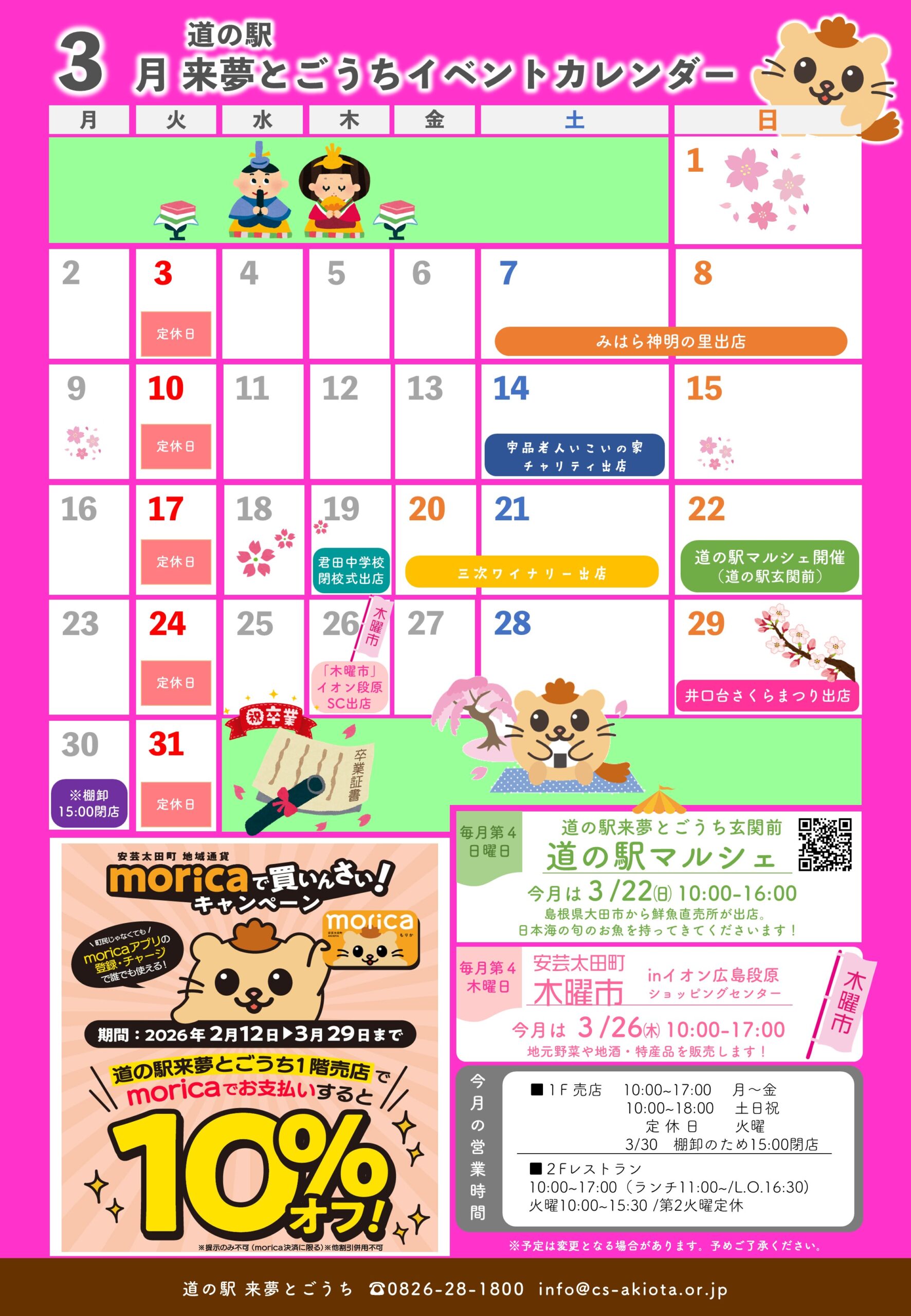 道の駅来夢とごうちのイベントカレンダーです。イベントに多数出店しますので、ぜひお立ち寄りください! ※予定が変更となる場合があります。予めご了承ください。