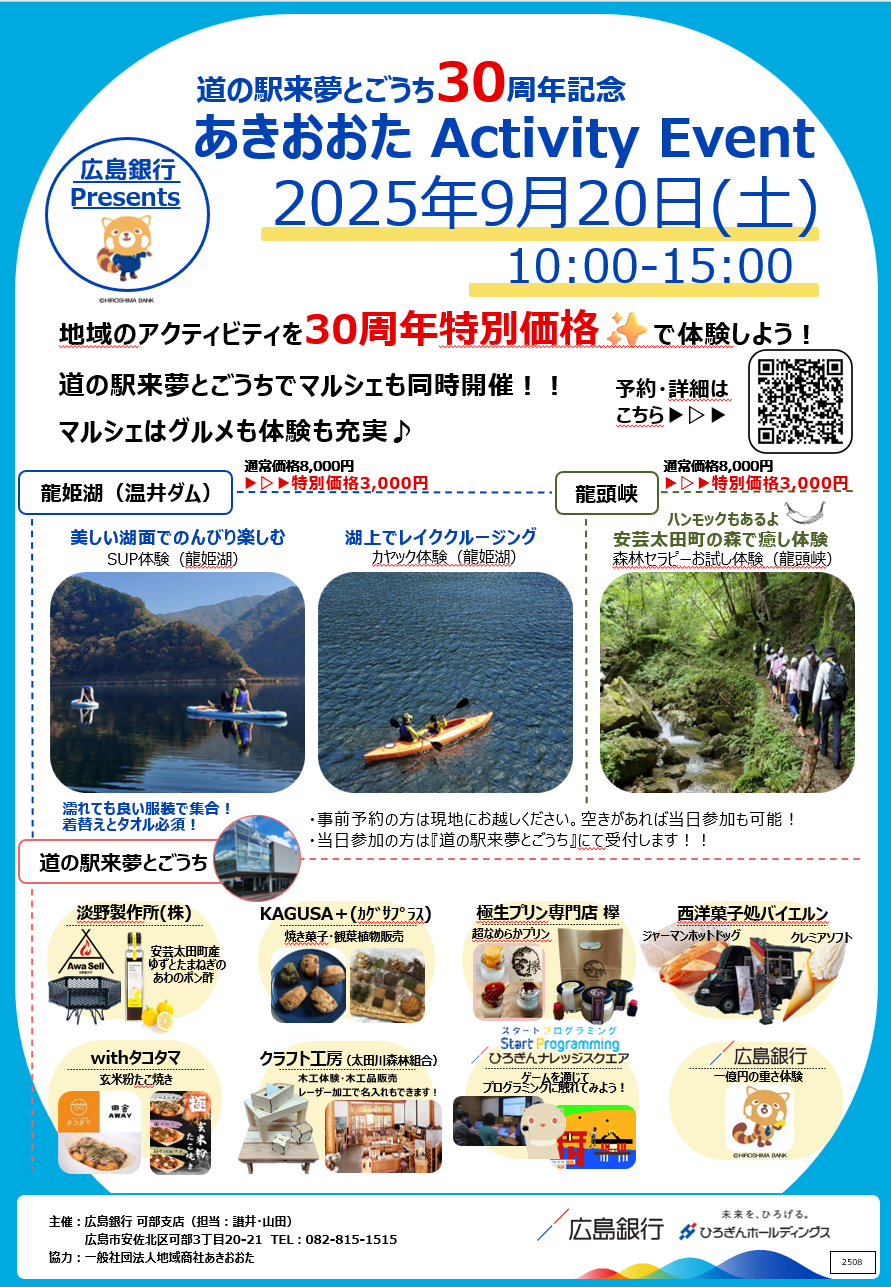 道の駅来夢とごうちの開業30周年を記念して、地域のアクティビティを30周年特別価格で体験できる「あきおおた Activity Event」が開催されます。