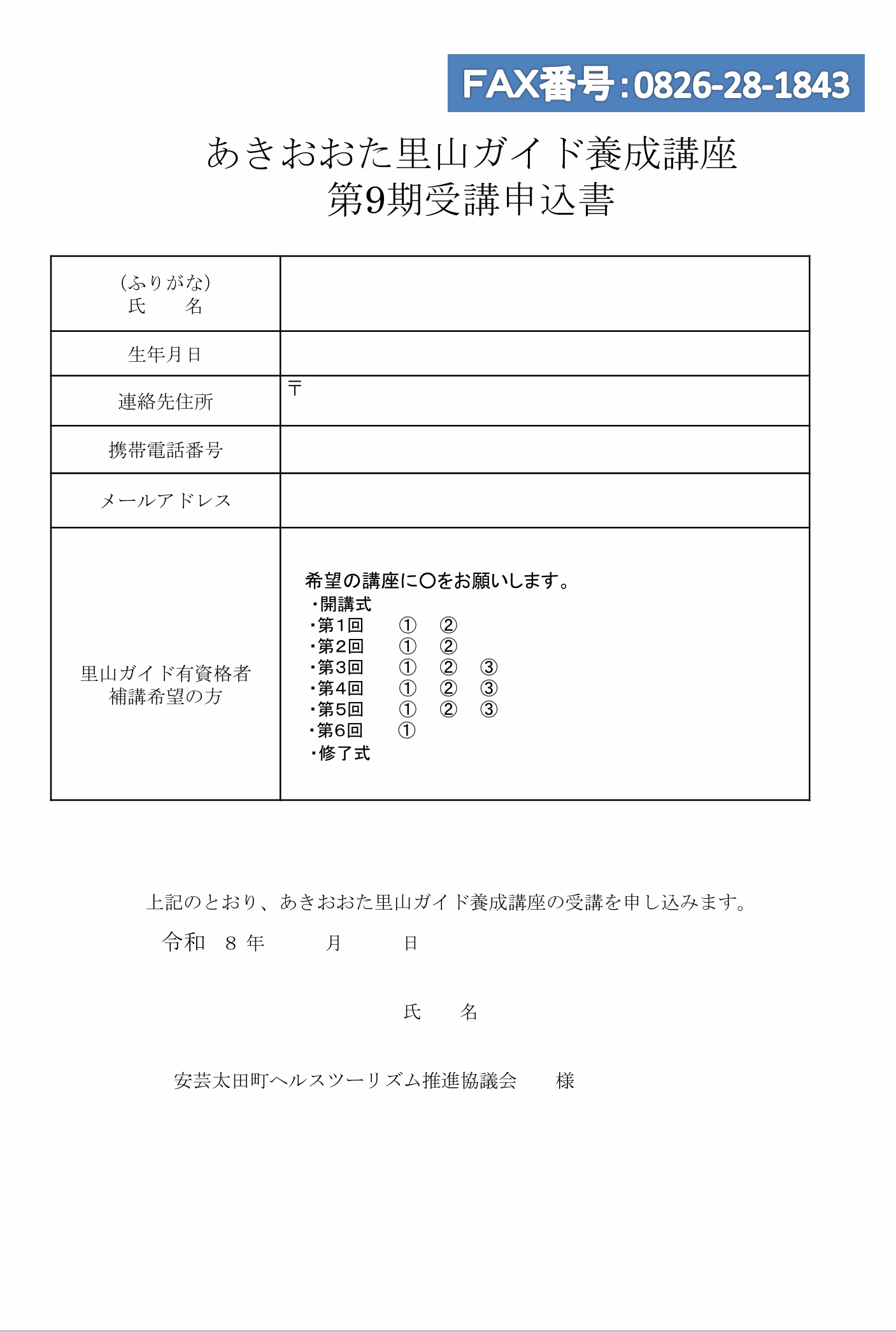 安芸太田町ヘルスツーリズム推進協議会事務局へ電話・FAX・メールにてお申込み下さい。