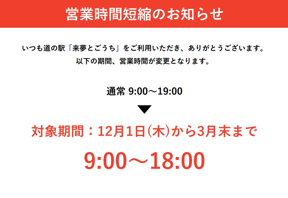 いつも道の駅来夢とごうちをご愛顧いただきありがとうございます。道の駅来夢とごうち(1F売店)は、2022年12月1日~当面の間、18時までの営業となります。