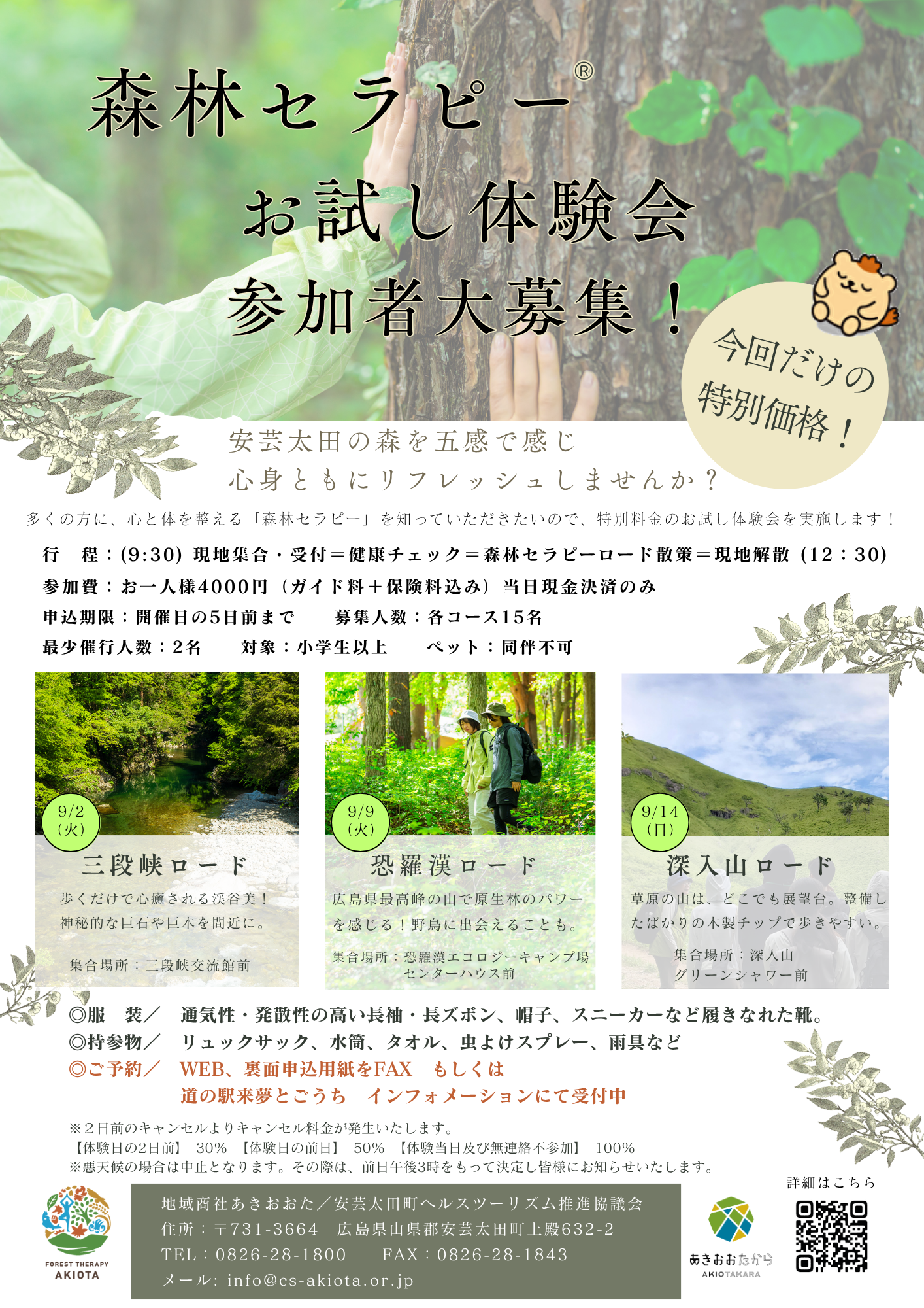 安芸太田町には5つの森林セラピーロードがあり、各コースそれぞれ違った魅力があります。この度、多くの方に心と体を整える森林セラピーを知っていただきたくて、特別料金のお試し体験会を実施します。