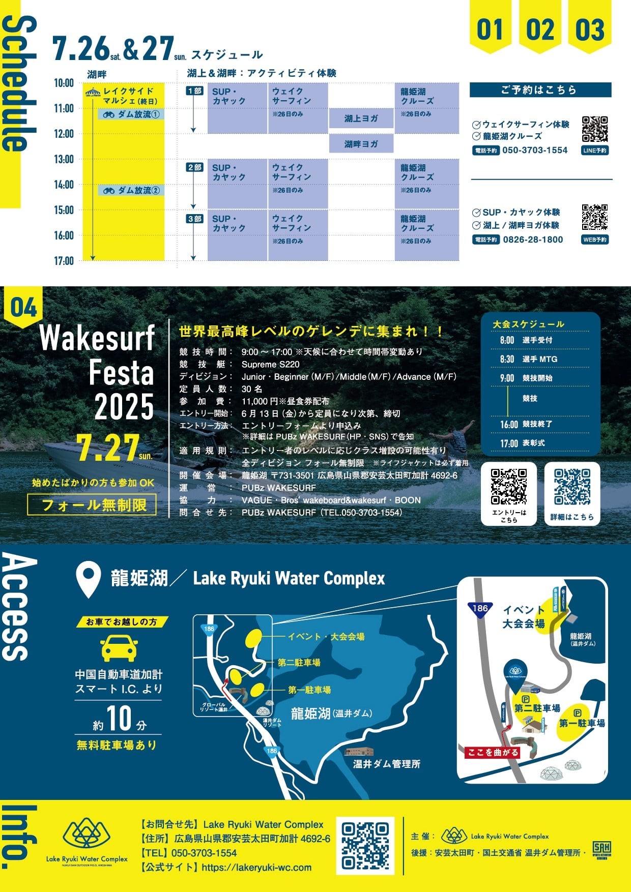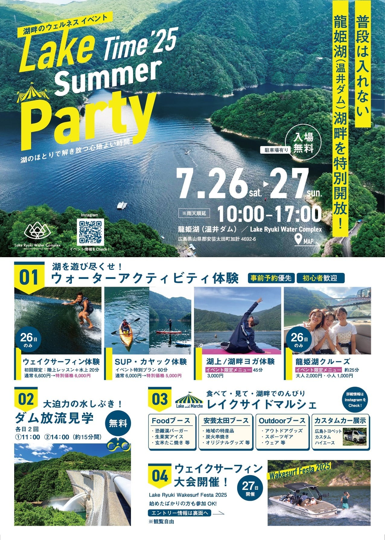 飲食・物販・展示ブースが設置され、SUP、KAYAK、YOGA体験、龍姫湖クルーズ、ウェイクサーフィン大会・体験、温井ダム放流といった龍姫湖全体を巻き込んだ一大ウォーターイベントです。
