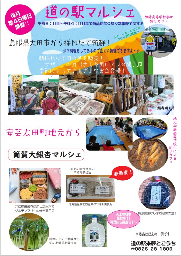 毎月第4日曜日(9時~16時)に、広島市と益田市をつなぐ国道191号線にある立地を生かして【道の駅来夢とごうち〔戸河内IC前〕】で新鮮な山陰のお魚や地域のおススメ商品などが集まるマルシェです。