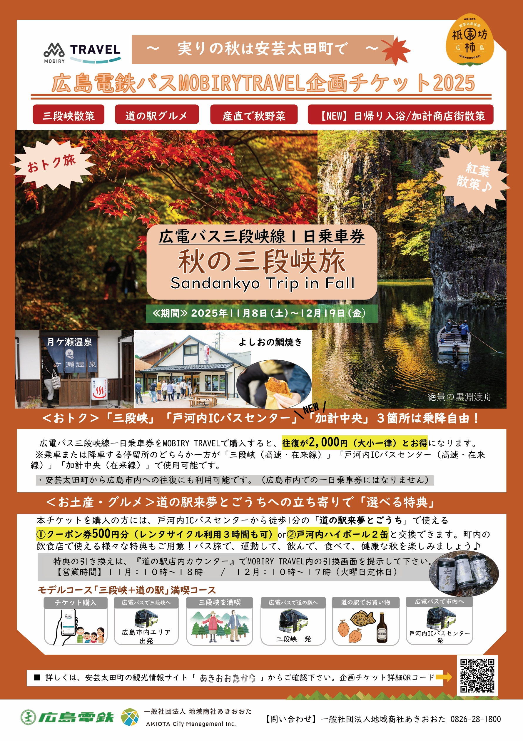 2025年11月8日(土)より期間限定でMOBIRY TRAVEL(モビリー トラベル)企画乗車券 が販売開始されます。今年からは三段峡・道の駅来夢とごうち(戸河内ICバスセンター)だけでなく、加計(加計中央)を加えた3箇所にて乗降が自由にできるようになりましたので、三段峡の紅葉、祇園坊柿、道の駅、加計の町グルメなど秋の旬をご満喫ください。