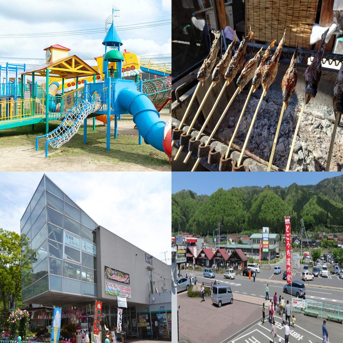 ~昼食、食べ歩き&産直・川魚塩焼き(週末限定)など満喫、家族で『わくわくランド』で遊んだり、クーポンで食事やレンタサイクルも~