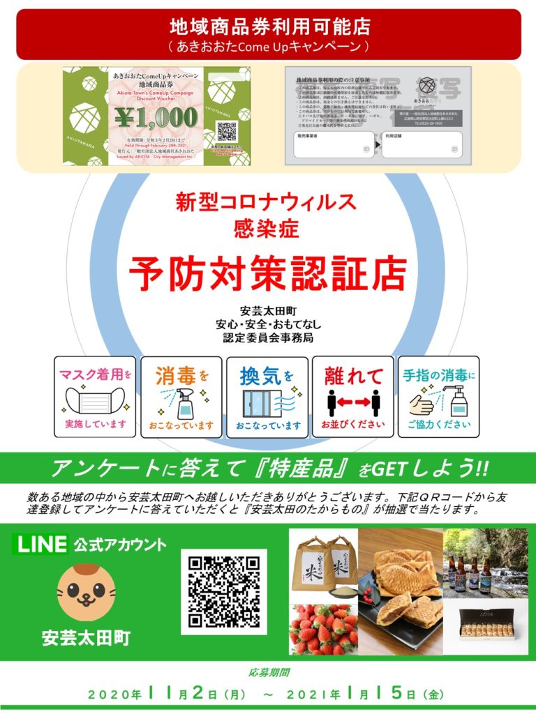 この度は、あきおおたCome Upキャンペーンを利用して体験、プレミア率100%の地域商品券(安芸太田町独自発行)をご購入頂きありがとうございます。