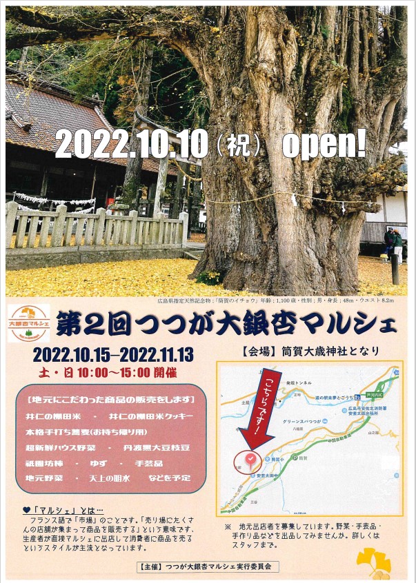 秋が深まるにつれ、“ 黄金のじゅうたん ”が現れる「筒賀(つつが)の大銀杏」。 その場所の隣で、昨年も好評だった『つつが大銀杏マルシェ』が今年も開催されます。