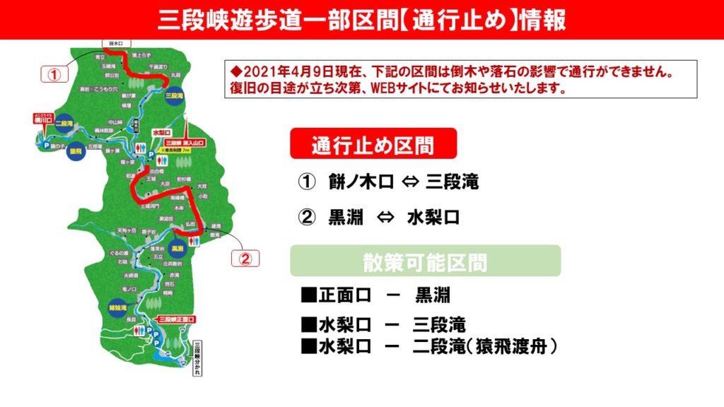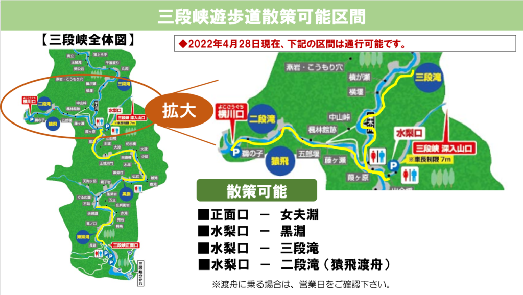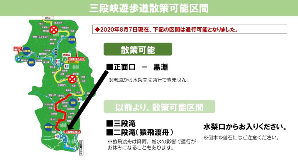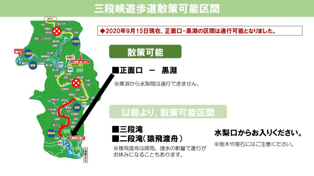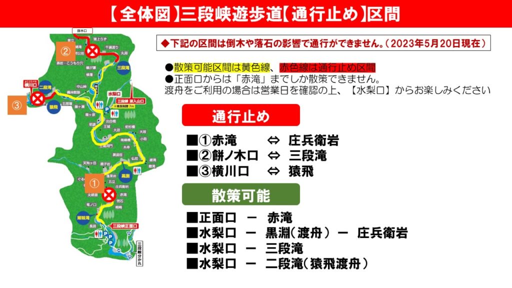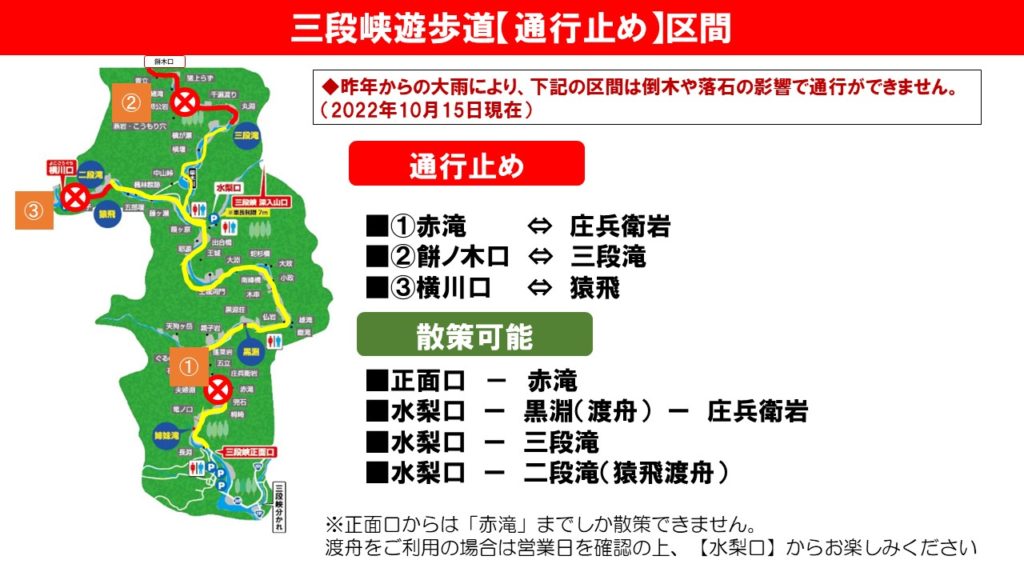 三段峡の遊歩道について、通行可能区間と通行止め区間をお知らせ致します。復旧工事作業のほか危険な場所もありますので、絶対に立ち入らないでください。通行可能区間内での散策をお楽しみください。