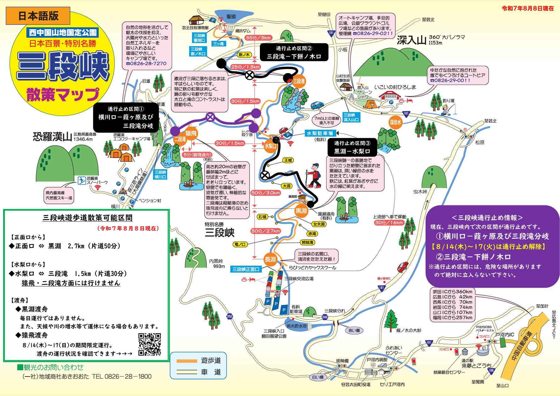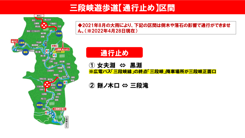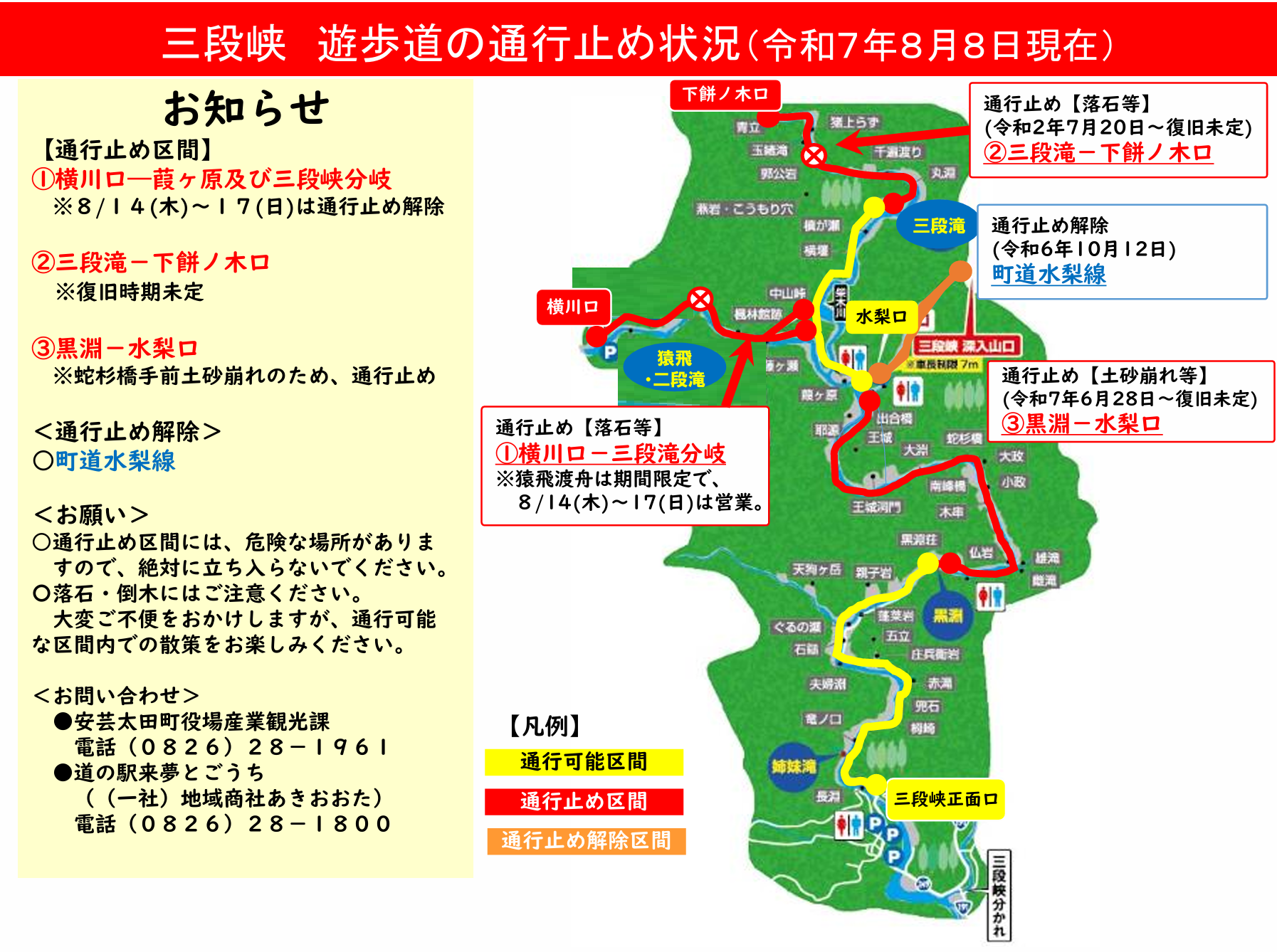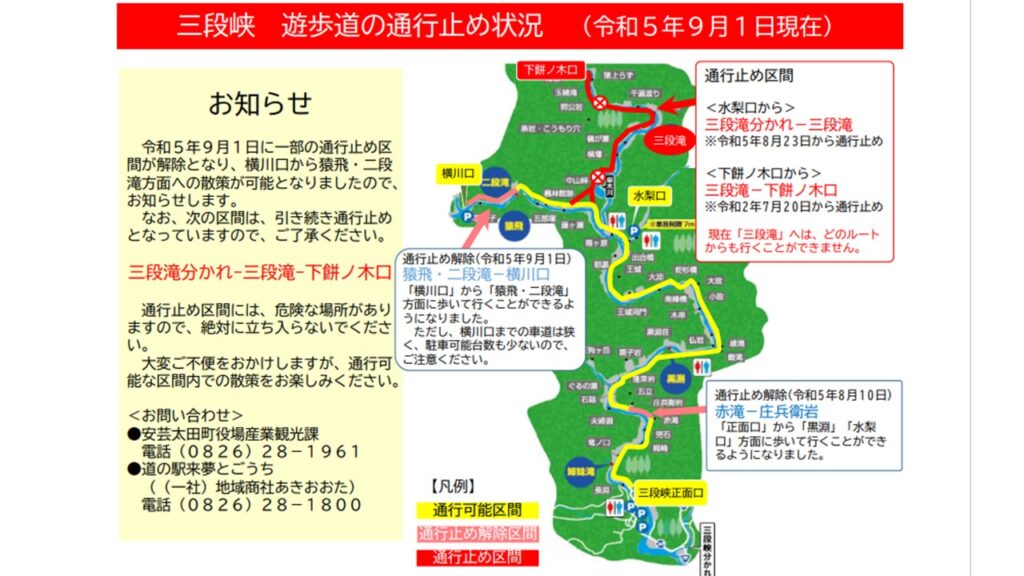 三段峡の遊歩道について、通行可能区間と通行止め区間をお知らせ致します。復旧工事作業のほか危険な場所もありますので、絶対に立ち入らないでください。通行可能区間内での散策をお楽しみください。